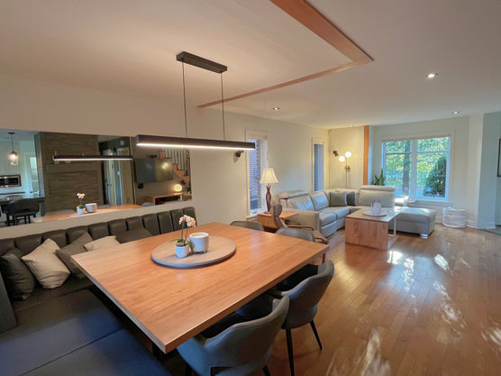 Le mandat était de transformer cette salle a diner pour en faire un espace plus convivial, multifonctions (repas, devoirs et jeux) avec plus de places assises intégré au salon. Sa grande banquette très confortable, avec rangement intégré, prises régulière et USB ainsi qu'un plateau rotatif central en font un des endroits les plus fréquenté maintenant. L'ajout d'un miroir pleine largeur et des chaises avec un dossier plus bas permettent décloisonne tout en apportant de la légèreté. Jointe au salon, cette zone devient un pôle attractif pour tous.